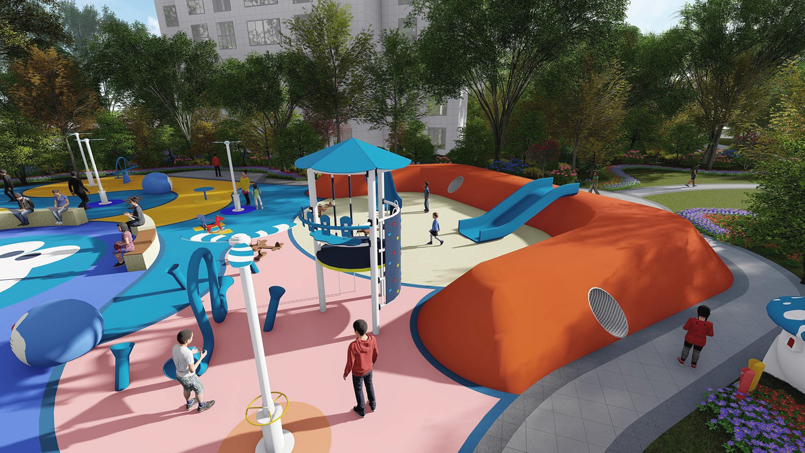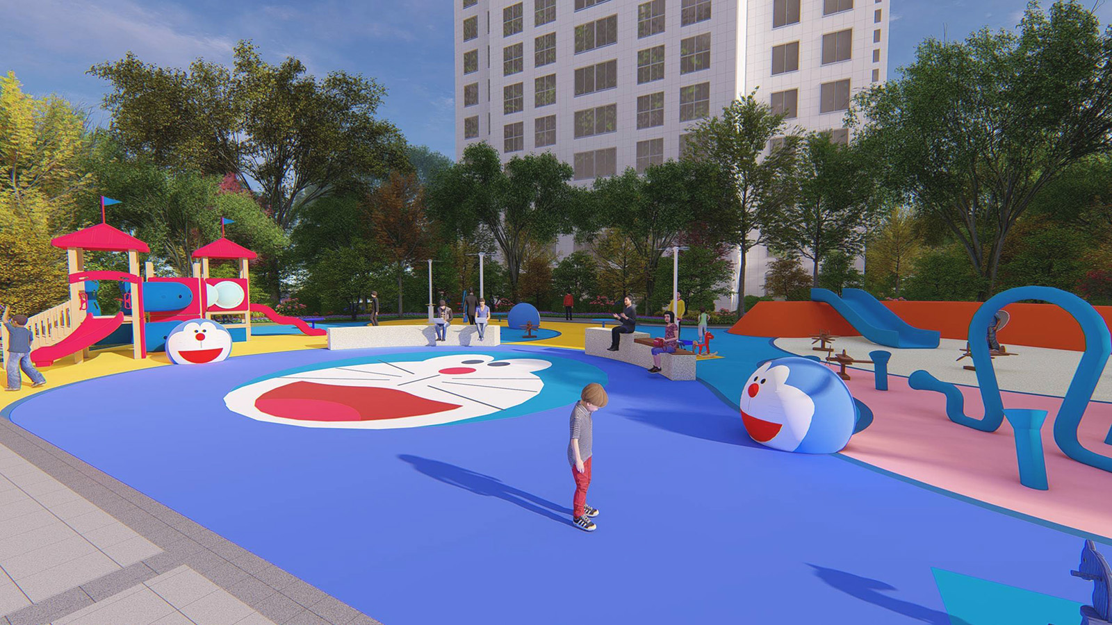 兒童活動區(qū)以五感體驗為設計理念,融入經(jīng)典卡通形象“哆啦A夢” 為設計主題,通過新穎的互動性設計充分調動兒童的聽覺、視覺、味覺、嗅覺、觸覺體驗,使兒童獲得獨特的感官體驗的同時,童夢童享,啟發(fā)兒童想象力、創(chuàng)造力,并為整個家庭創(chuàng)造一個寓教于樂的優(yōu)美園林空間環(huán)境。
