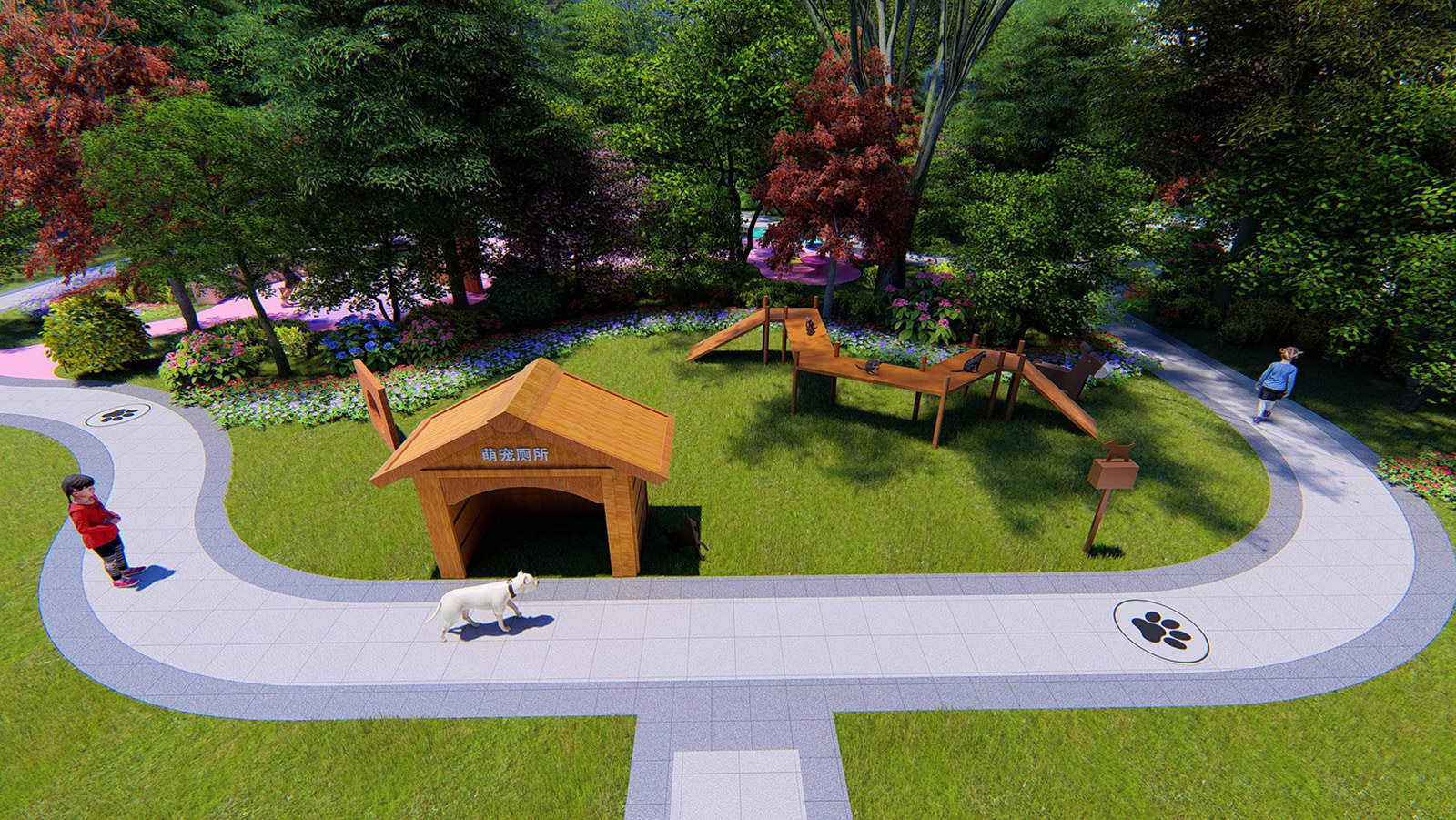 萌寵樂園組團綠地內布置萌寵步道、交友嬉戲場地,方便業(yè)主走出家門,日常散步遛狗的生活需要,布置寵物廁所(沙坑)、和糞便清理袋取用裝置、洗手池等設施,便于主人在訓練寵物后使用,保證周邊的衛(wèi)生安全,