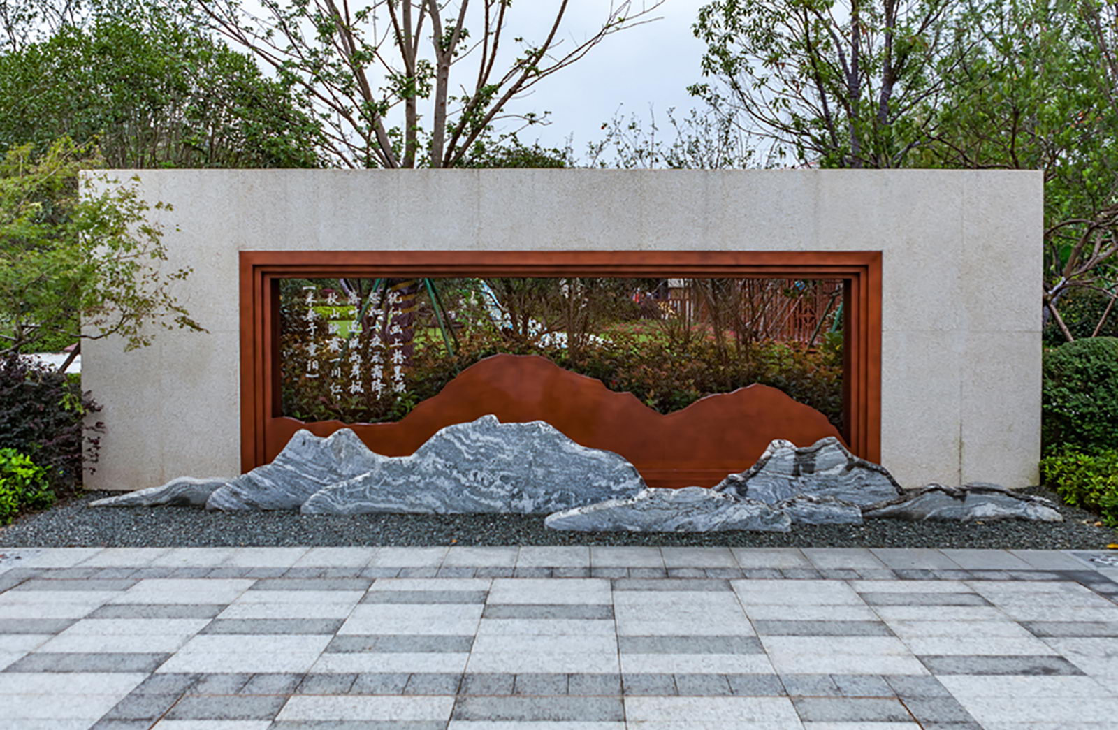 主題旱溪借用蘇州古典園林“破隅” 設計手法,以微縮旱溪作為耒水一隅一脈,與耒水虛實輝映,以小見大,互妙相生。