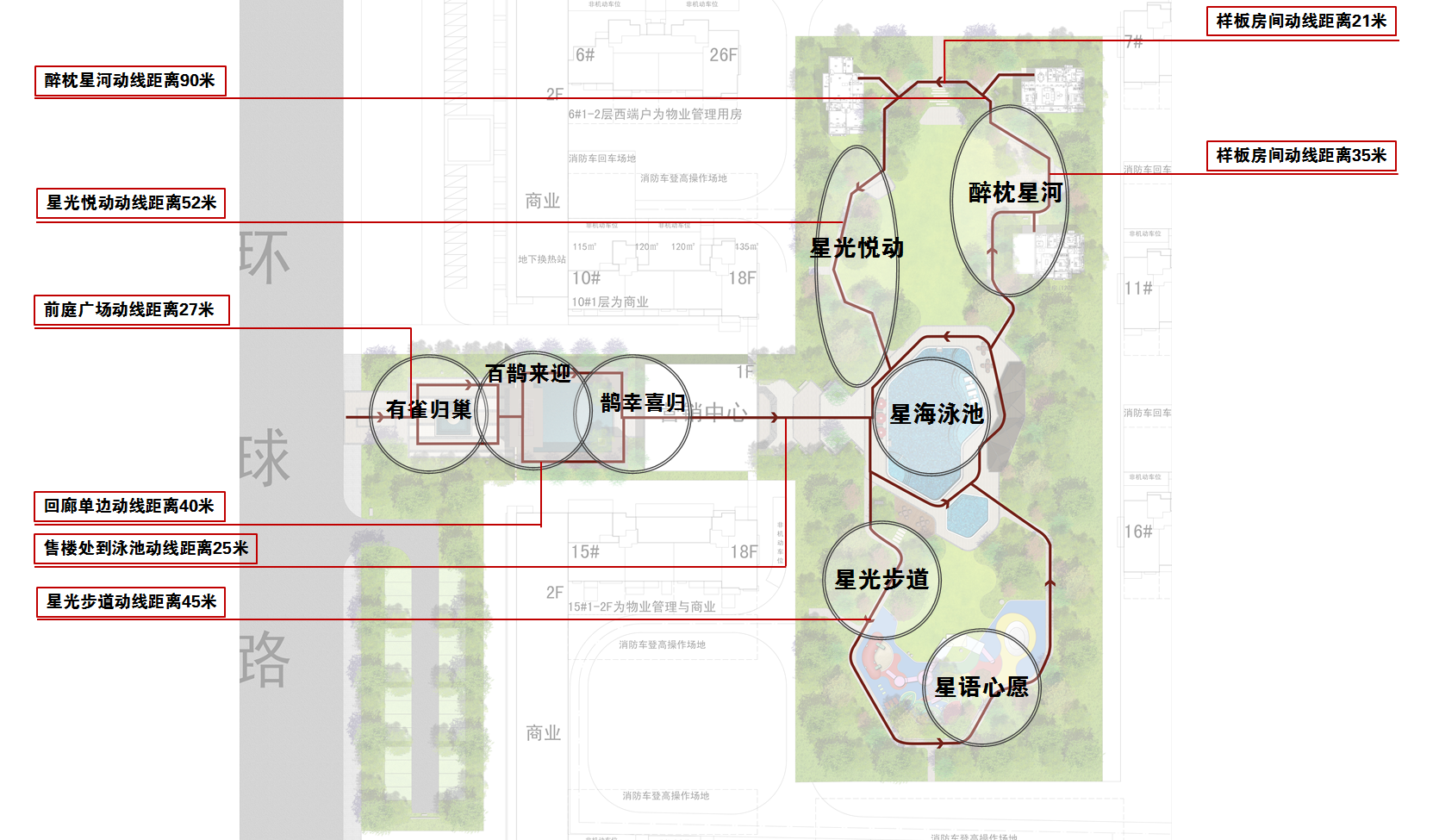 星光步道——曲徑通幽,兩側林蔭成趣,芳草鮮美,落英繽紛,自然引導客戶沿著精心設計的游線進入下一個雅趣空間。