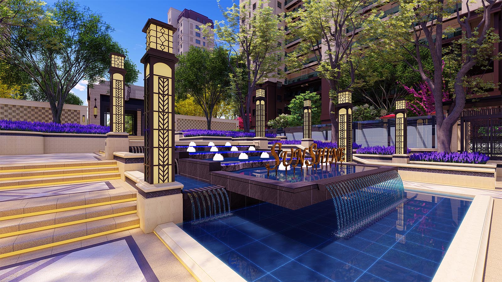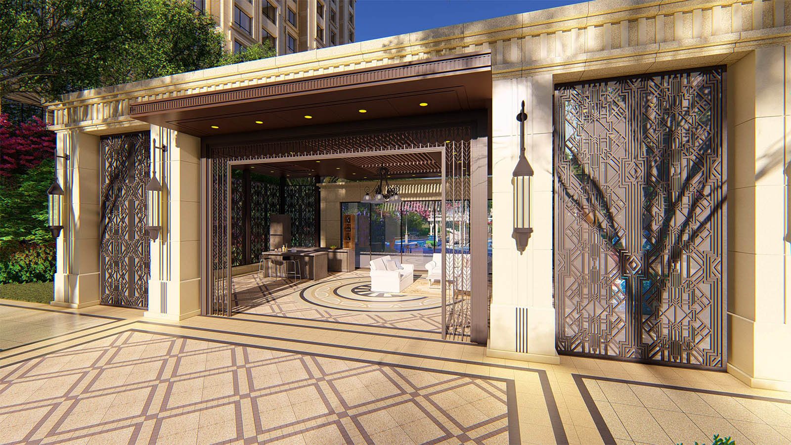 古典的中軸線配合精致的線腳,形式精美又富有力量,前廣場門頭雍容華美,入口對景層層疊疊水景精致動人,引人入勝。