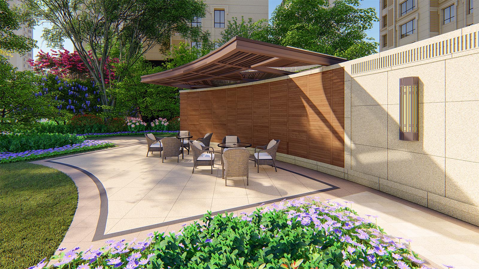 休閑花園旨在為鄰里之間創造一個和諧交流,促進社區鄰里關系的活動空間,設置休閑景觀構架,同時擺放戶外休閑座椅,方便開展戶外沙龍活動、老友新鄰活動等,和諧鄰里,人性關懷。